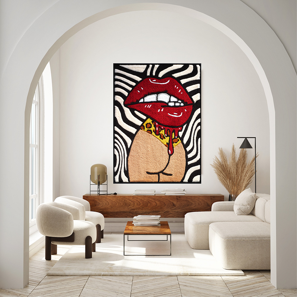 Uit deze ontmoeting ontstond BITE: een krachtig, ambachtelijk kunstwerk van Fins merinowol, gevat in een hardhouten lijst en uitgevoerd in een gelimiteerde oplage van vijf stuks.